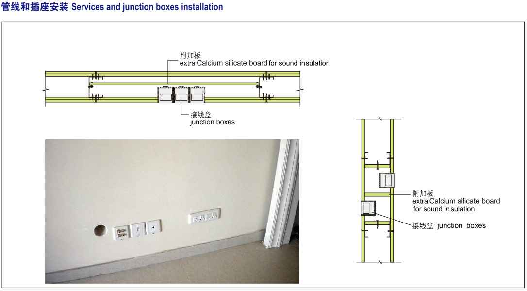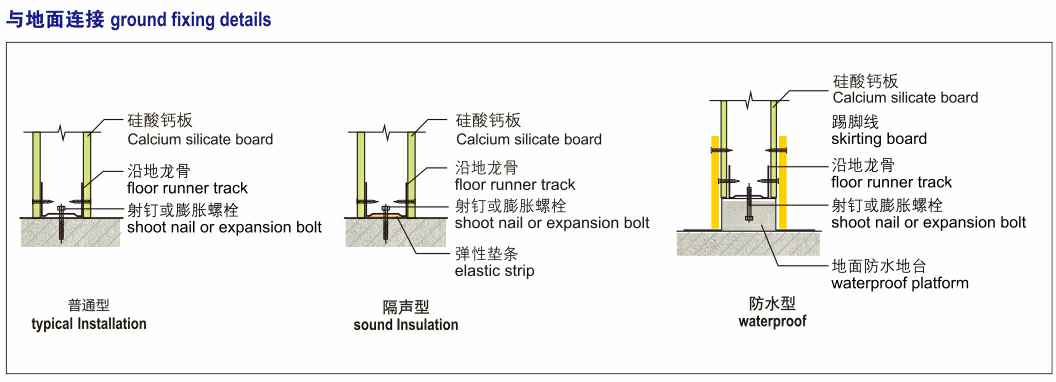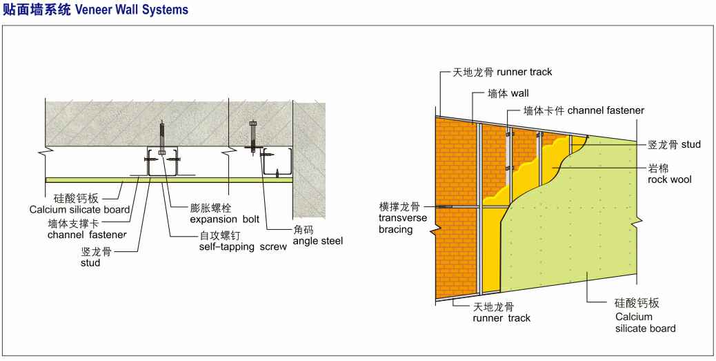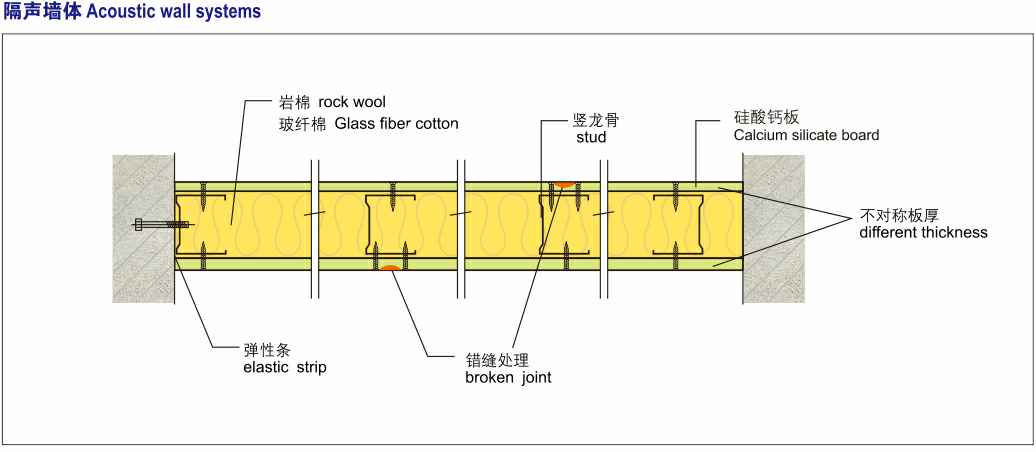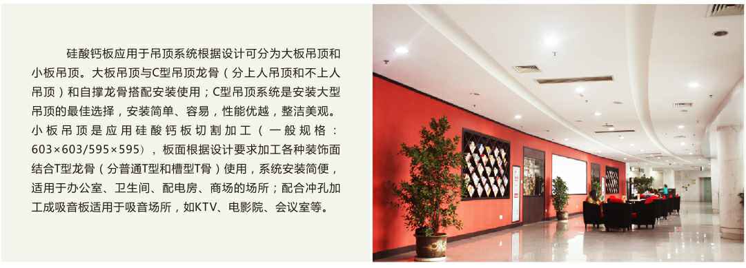 硅酸钙板采用多种硅质和钙质材料混合,经高温高压反应合成均衡紧密的石晶体结构,其优越的性能、环保产品非常适合现代化建筑装饰场所使用。应用于隔墙系统主要涉及到:力学特性、防火性能、隔热保温性能、空气隔声性能、占地面积。墙体载重等方面因素,硅酸钙板与轻钢龙骨组成的隔墙系统可以满足以上要求,为设计师提供优质的创意设计空间。