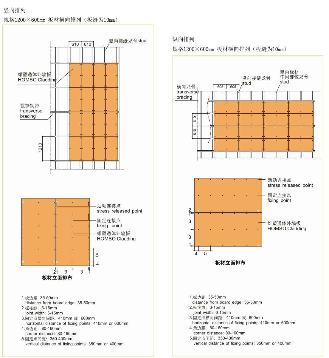 板材安装可横向排列,也可纵向排列,每张板四个角为应力释放点,其余为固定安装点,应力释放点钉